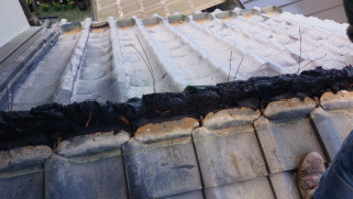- 棟瓦が波打って見える/一部がズレている