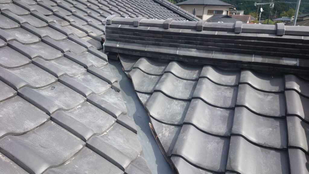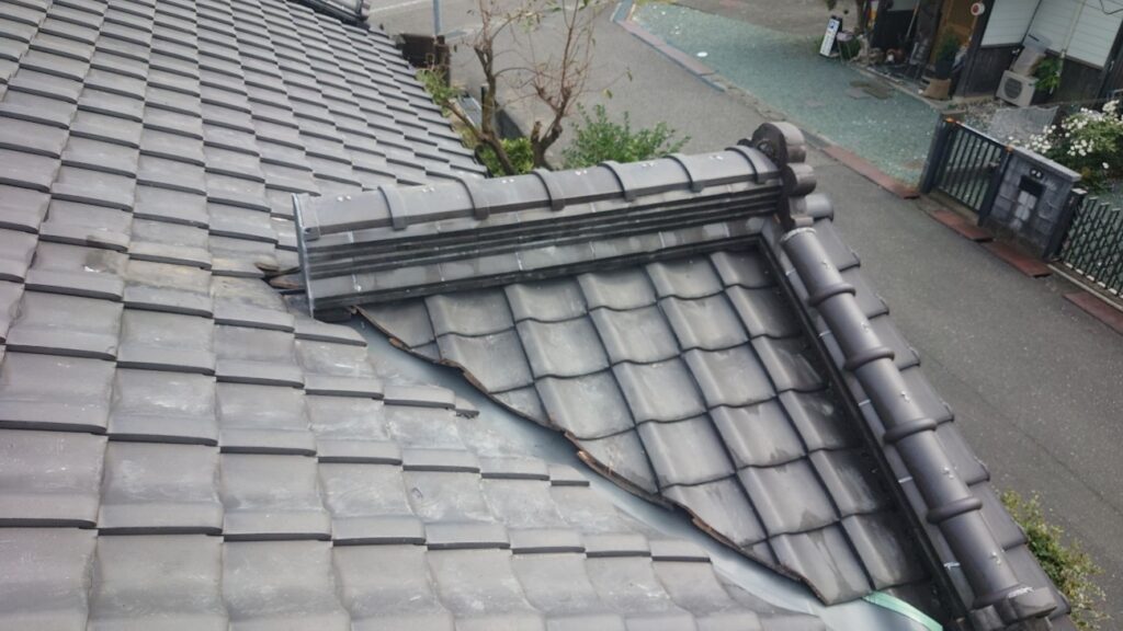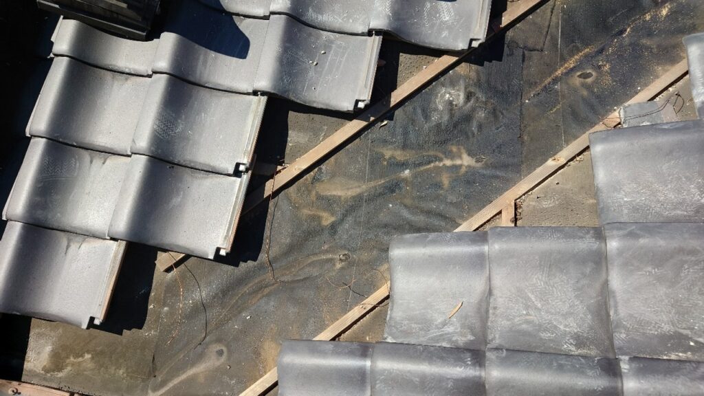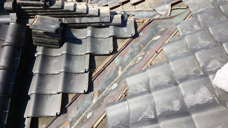 天井の一部分から雨漏りをしているとのことだったので、経年劣化した谷板をステンレス製に交換し、棟瓦や桟瓦を元の状態に戻して部分的な雨漏りを解決しました。